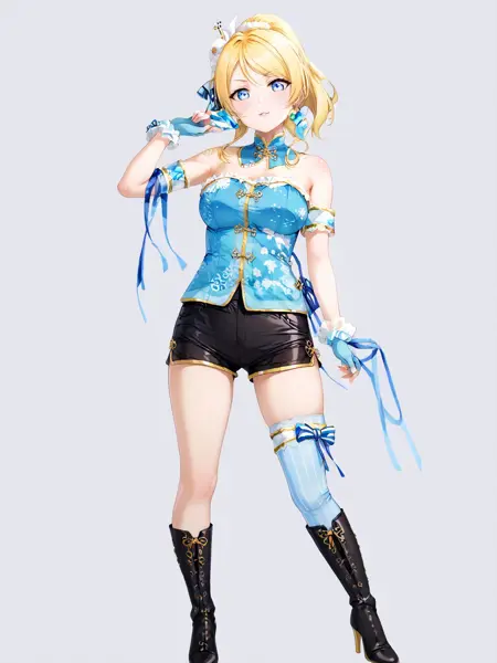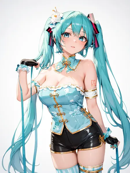 erichina,armband,gloves,fingerless gloves,chinese clothes,hair flower,hair ornament,ribbon,hair bow,hair ribbon,bow,shorts,black shorts,short shorts,latex shorts,bare shoulders,detached collar,blue shirt,strapless,single thighhigh,striped,striped thighhighs,vertical-striped thighhighs,boots,knee boots,high heels,high heel boots,black footwear,