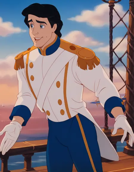 white tailcoat, knee-length jacket tails, dark blue pants, gold epaulettes, white baldric, black boots, blue collar and cuffs, white gloves, gold embroidery, massive gold buttons,