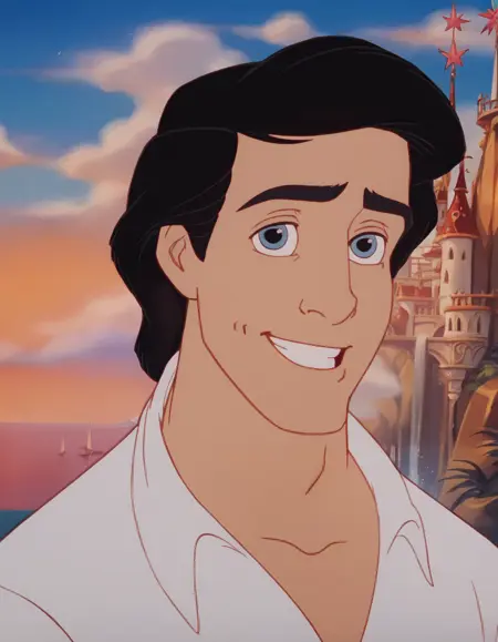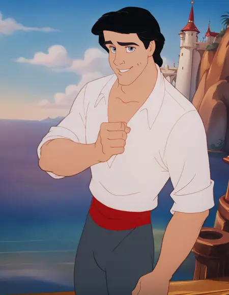 white shirt, three-quarter sleeves, red waistband, gray pants, black boots,