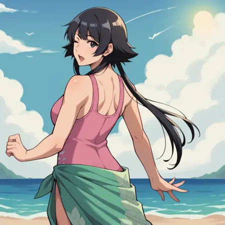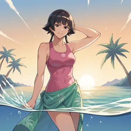 额外信息: 最初我也想给她穿上白色外褂+黄色腰带的装扮,但这样会与她的默认造型冲突太多,而我想专注于她的发型,因此最终决定不添加。此外,泳装造型显然来自动画,而中式服装则来自“斑目之战”卡牌或类似来源。