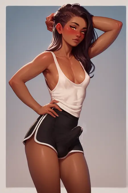 • 1girl, dark_skin, large_breasts, blush, nut_thru, ejaculation, looking_to_the_side, cleavage, shirt, shorts