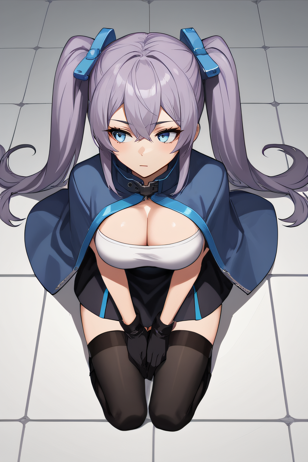 | 训练词汇 | twintails, purple hair, grey hair, two tone hair, blue eyes, collarbone, cleavage, black hair ribbons, shinning collar, dark blue cape, black thighhighs, (blue strap around belly), black skirt, black gloves已复制! ponytail, purple hair, grey hair, two tone hair, blue eyes, large breasts, baseball uniform, blue baseball cap, white shirt, black layered sleeves, white shorts已复制! |