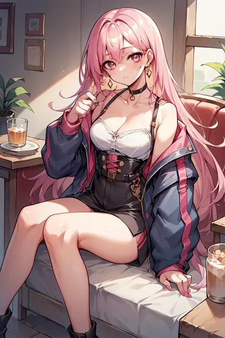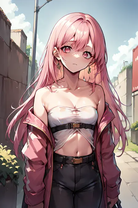 트리거 단어: maisynthv, 긴 머리, 분홍색 머리, 재킷, 크롭탑
