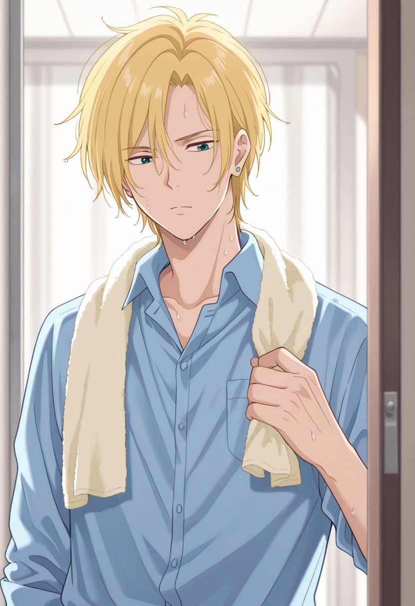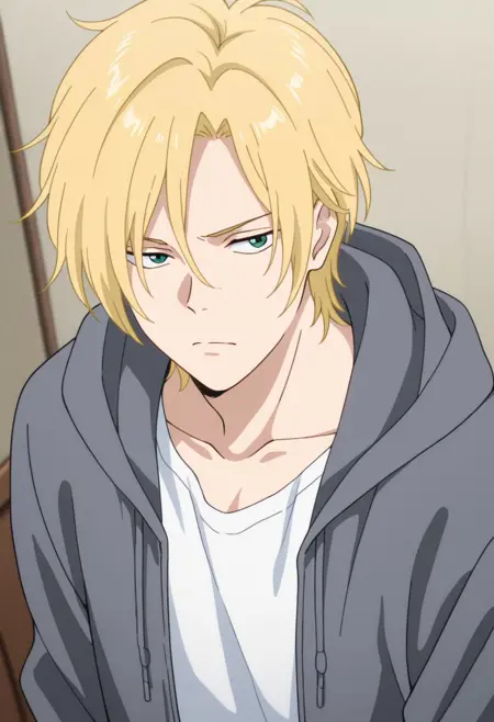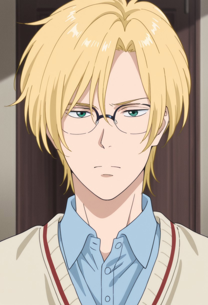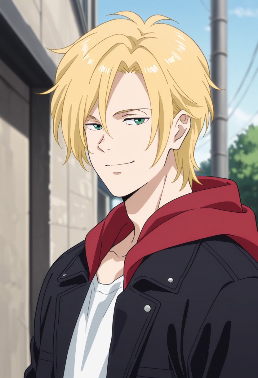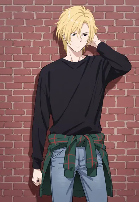 AsshuRinkusu, 1boy, 男性焦点, 单人, 绿眼, 金发, 黑色衬衫, 长袖, 绿色夹克, 格子夹克, 夹克系于腰间, 牛仔布,