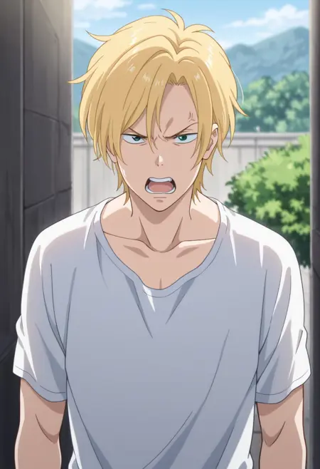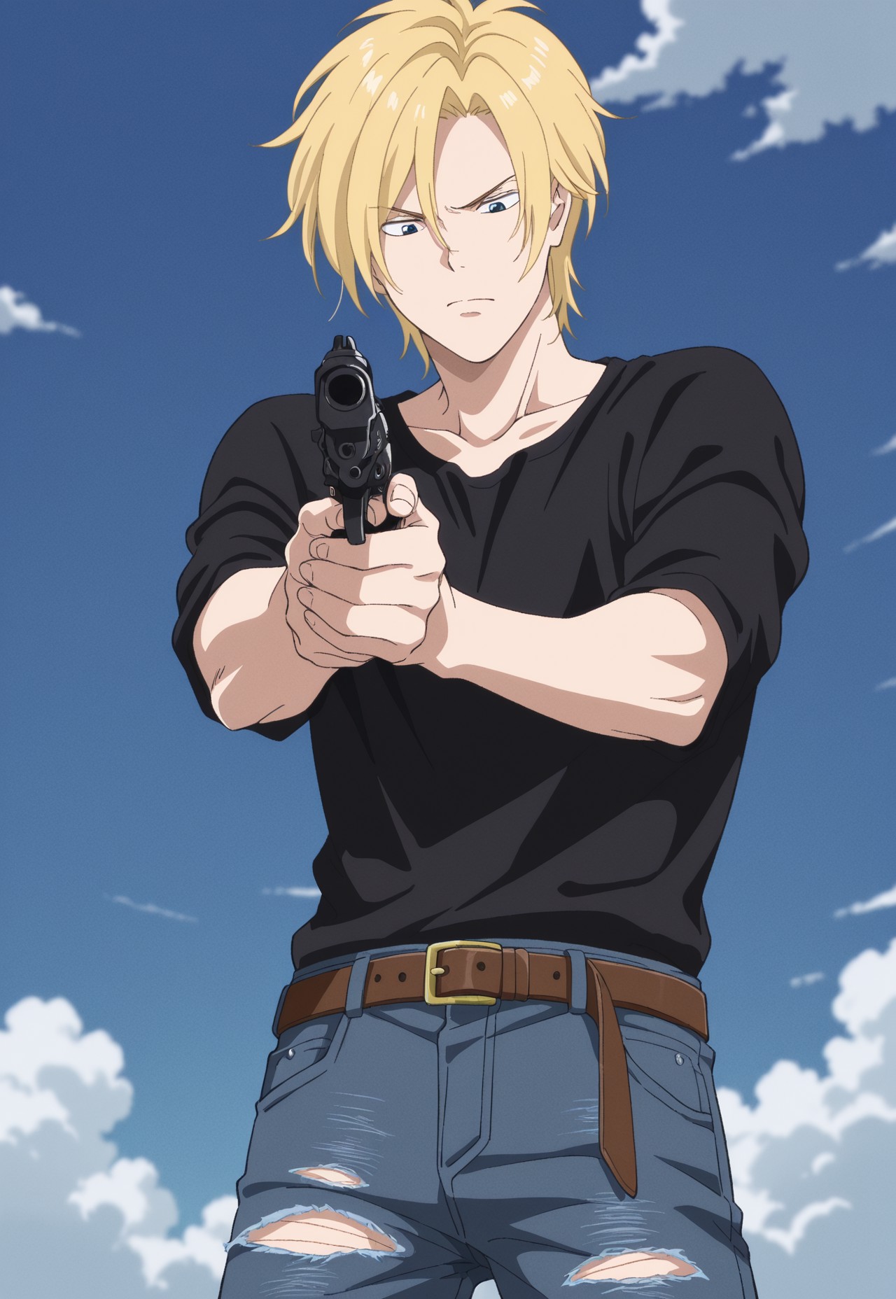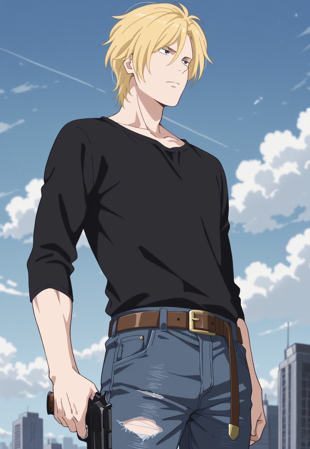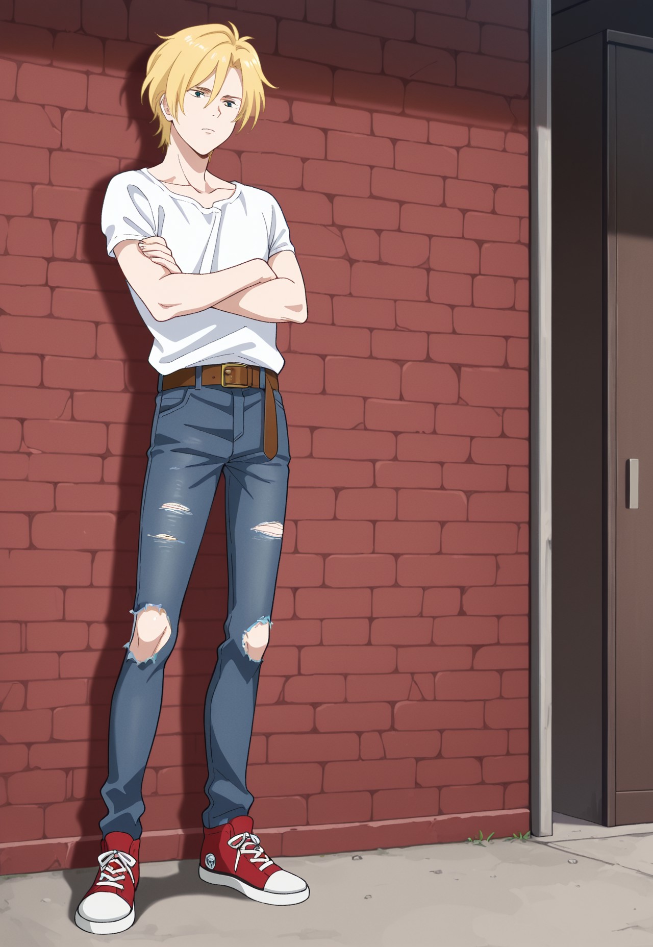 ashlynx, 1boy, 男性焦点, 金发, 绿眼, 单人, 牛仔裤, 裤子, 牛仔布, 衬衫, 破损衣物, 运动鞋, 鞋子, 腰带, 破洞裤子, T恤, 破洞牛仔裤, 白衬衫, 红色鞋履,