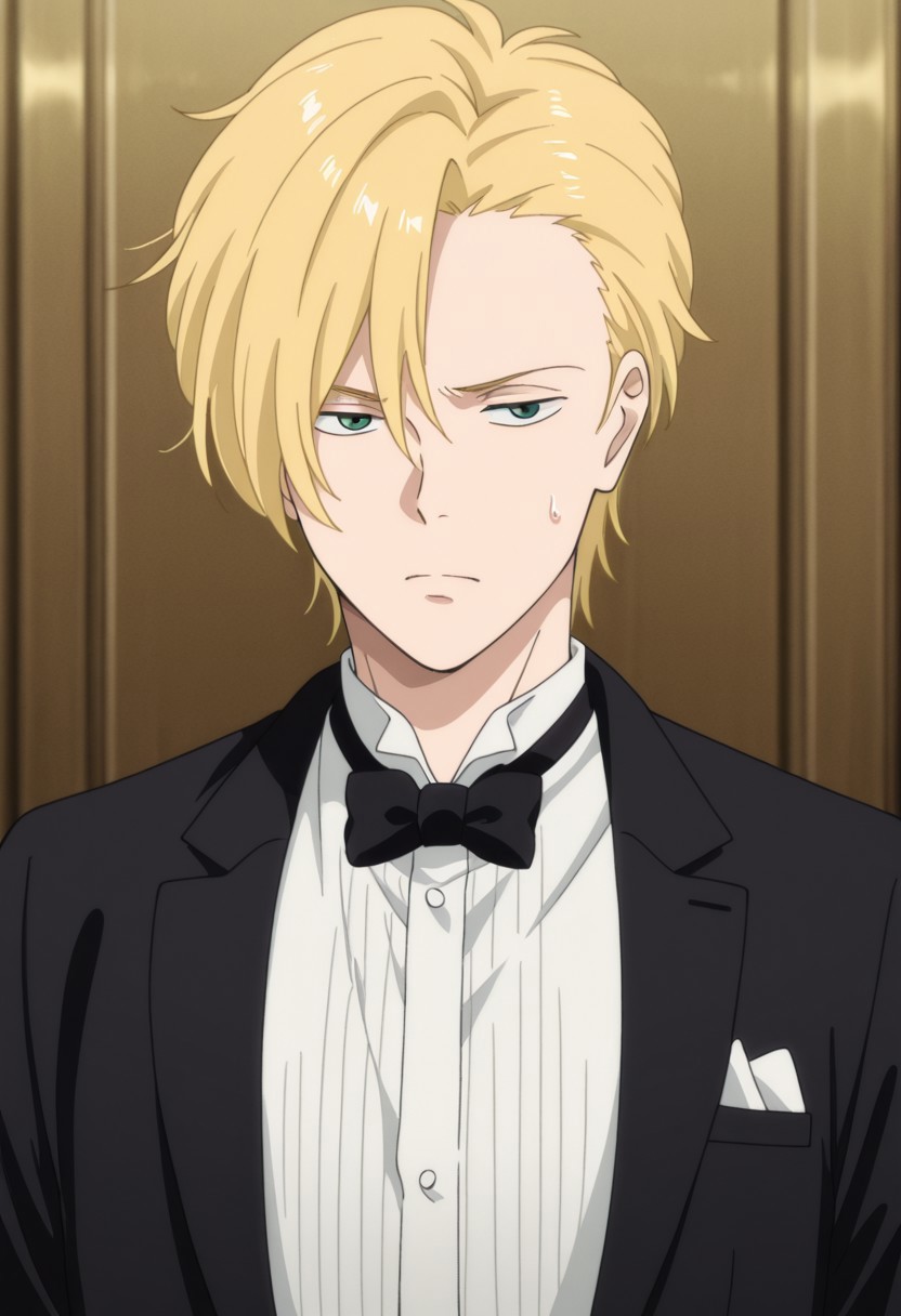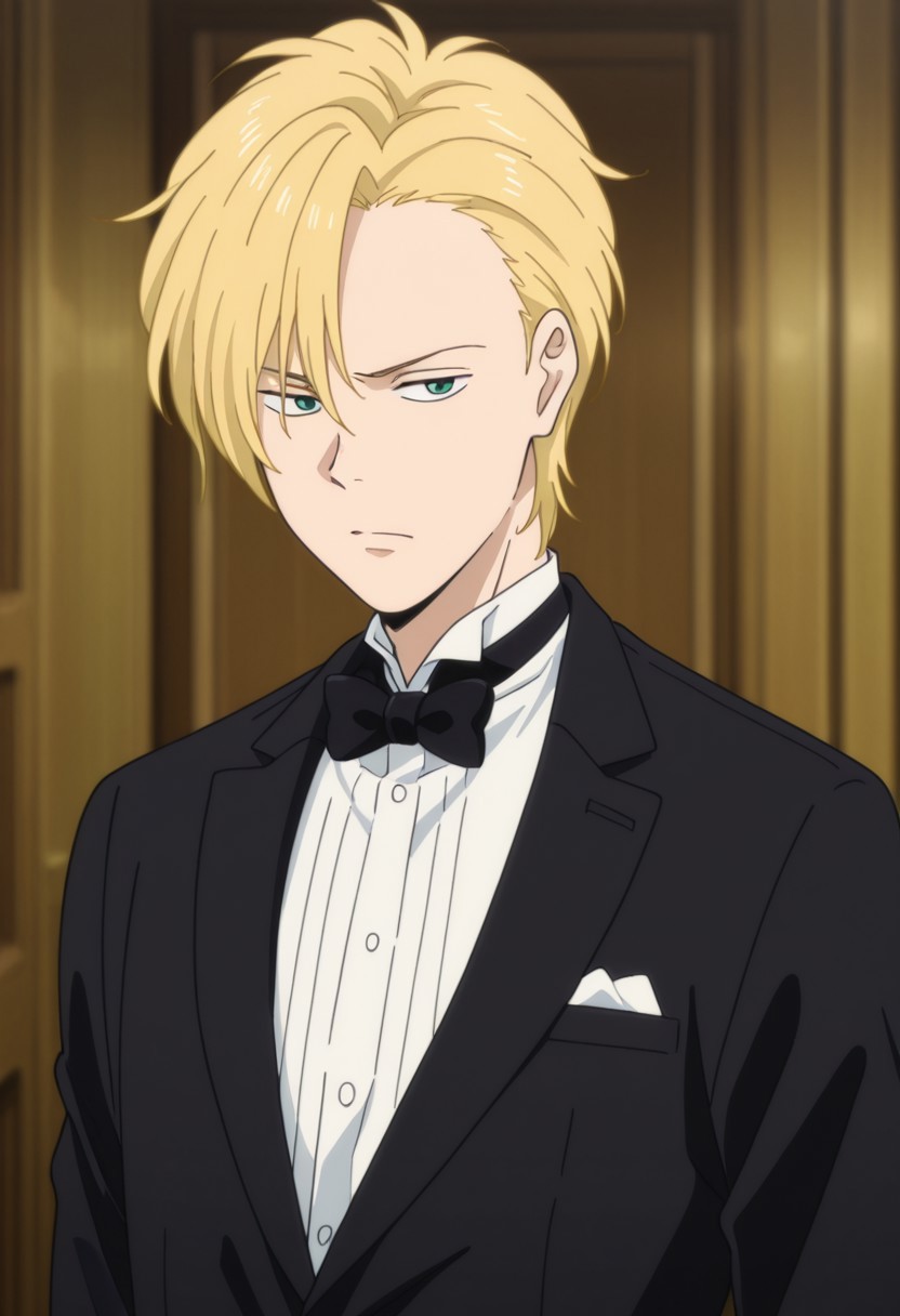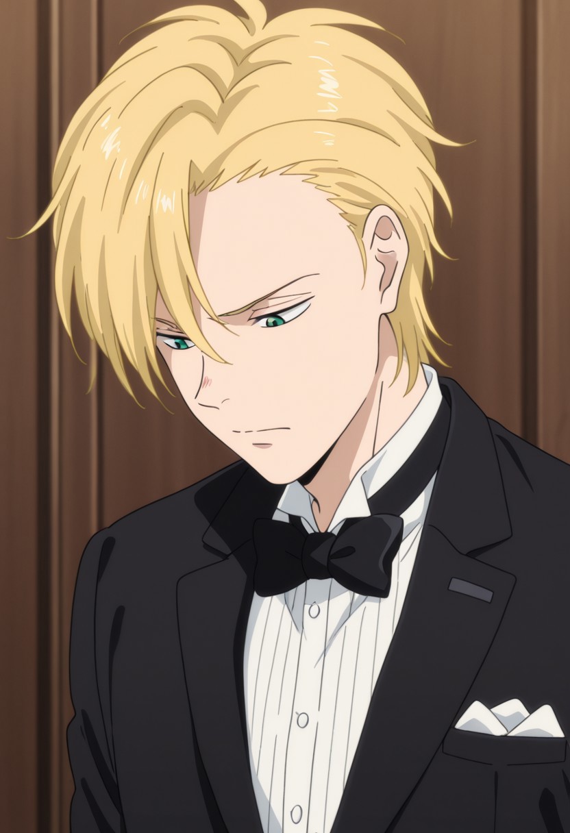 AsshuRinkusu, 1boy, 男性焦点, 单人, 绿眼, 金发, 不对称刘海, 西装, 衬衫, 白衬衫, 黑色领结, 黑色夹克, 黑色长裤,