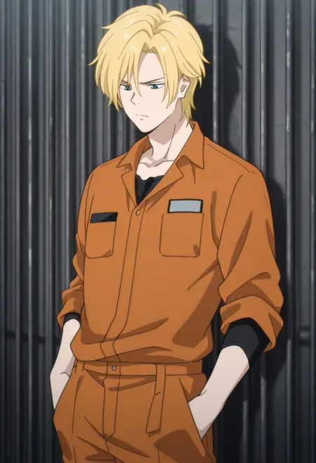 AsshuRinkusu, 1boy, 男性焦点, 单人, 绿眼, 金发, 监狱服, 锁骨, 橙色衬衫, 有领衬衫, 黑色背心, 袖子卷起, 橙色裤子,