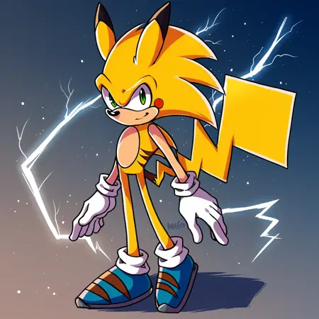 Sonichu, 1boy, solo, furry, yellow fur, green eyes, tail, white gloves, blue footwear,
