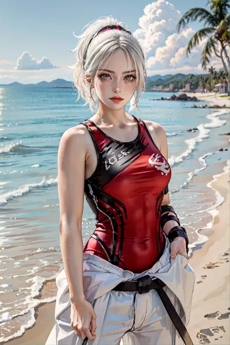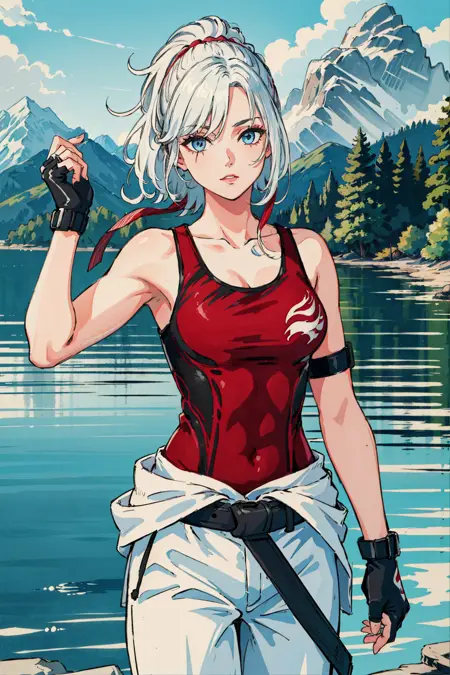 선택 사항: 눈 위에 상처, 탱크톱, 검은 벨트, 하얀 머리카락, 흰 바지, 파란 눈, 빨간 탱크톱