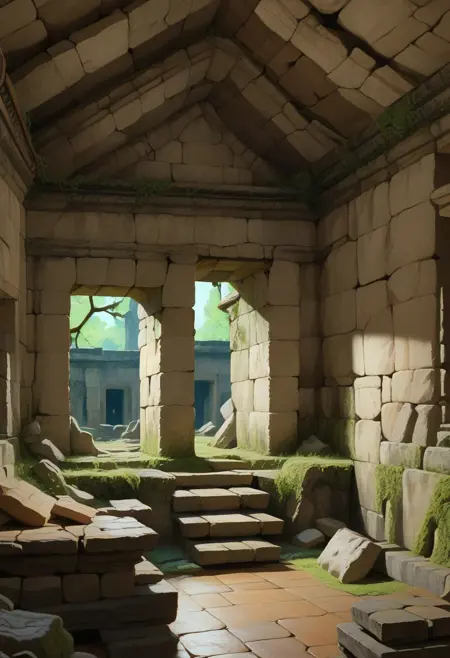 辅助标签:门道、走廊、窗户、拱门、柱子、石柱、浮雕、石阶、石墙、植被覆盖(指树木及其他植物生长于石块之间)、废墟(表示整体风化外观)、碎石堆(指真实的碎石堆积)、户外、建筑、风景(用于户外场景)、石墙、石地板、室内(用于室内)、苔藓(若不想让场景看起来像“避难所22”,请降低强度)、石制头像、雕像(用于雕刻的石面人像,仅用“雕像”表示普通类型。请注意,多数检查点会试图让面部显得非常……有生命力,尤其是当提示中包含苔藓或植被时)