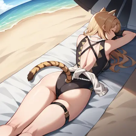 補足情報: 元々は「サイレスジャケット」としていたのですが、AIが彼女のカペレットをそれと誤認しました。その後、「水着カバー」として再学習しました(これは実際の衣装です。知りたければググってください)。しかし効果がいまいちでした。結局自分でプロンプトを設定したところ、サイレスブレザーがうまく動作しました。