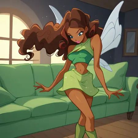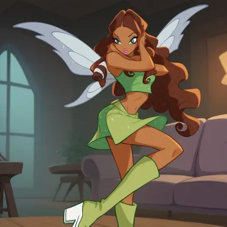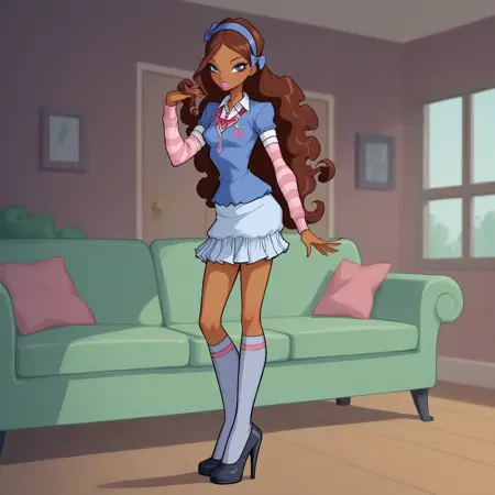 | 训练词汇 | school uniform, striped sleeves, socks, kneehighs, hairband, high heels, layered sleeves已复制! casual outfit, crop top, green skirt, belt, leg warmers, platform footwear已复制! green outfit, crop top, skirt, wings, boots, glitter已复制! xaishax, brown hair, long hair, curly hair, blue eyes, makeup, lipstick, dark-skinned female已复制! |