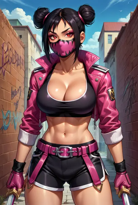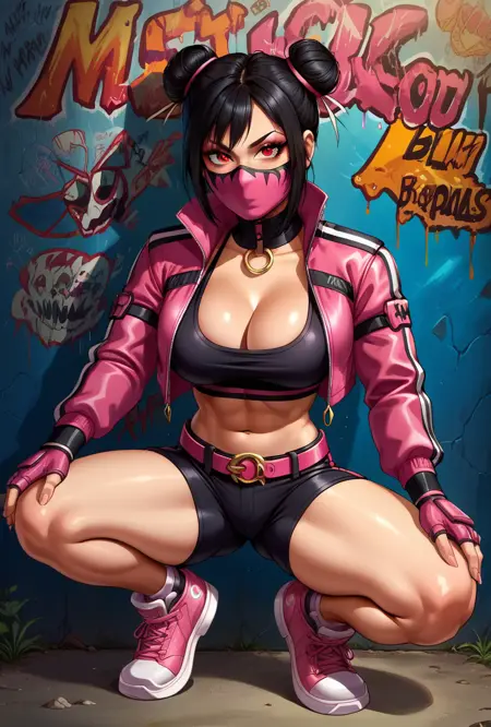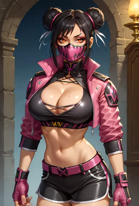 Mortal Kombat 1, Mileena, Official Alternate Outfit, Black Hair, Hair Buns, Glowing Blood Red Eyes, Pink Mouth Mask, Open Cropped Pink Puffer Jacket, Exposed Midriff, Black Sports Bra, Cleavage, Pink Fingerless Gloves, 2 Pink Belts, Skin Tight Black Shorts, Pink Sneakers