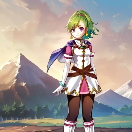프롬프트: 녹색 머리카락, 단발머리, 앞머리, 비대칭 머리카락, 측면 머리카락, 보라색 눈, 삼각형 귀걸이, 맨투맨, 파란 맨투맨, 작은 가슴, 만다린 칼라, 코트, 흰 코트, 리본 장식, 금장식, 안셔츠, 분홍색 셔츠, 분홍색 소매, 십자 벨트, 미니스커트, 분홍 스커트, 흰 장갑, 팔꿈치 장갑, 팔찌, 검정 스타킹, 흰 부츠, 무릎 부츠