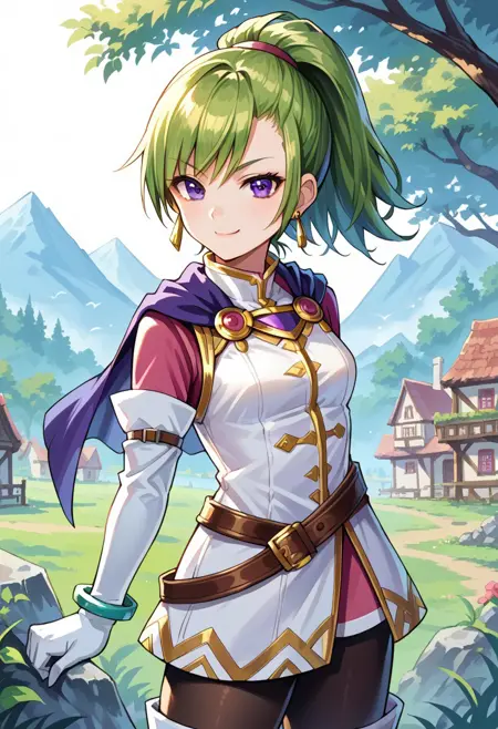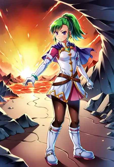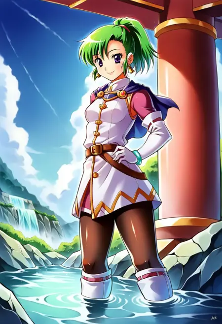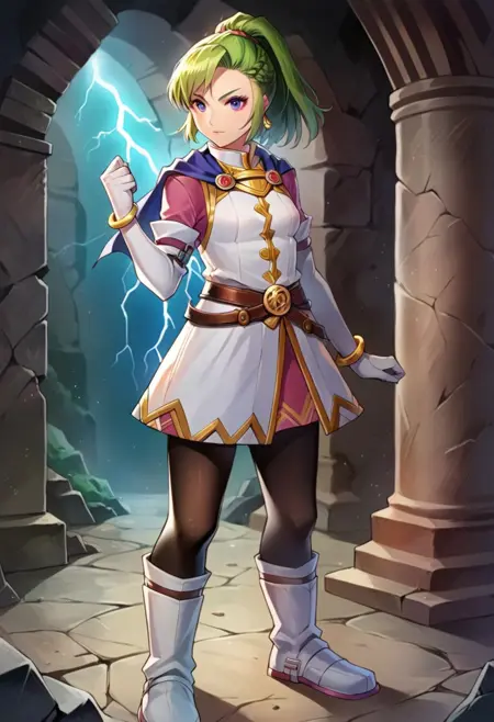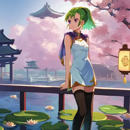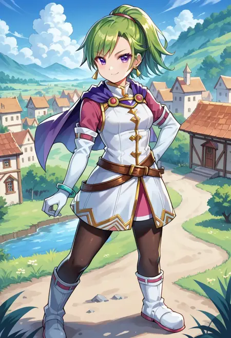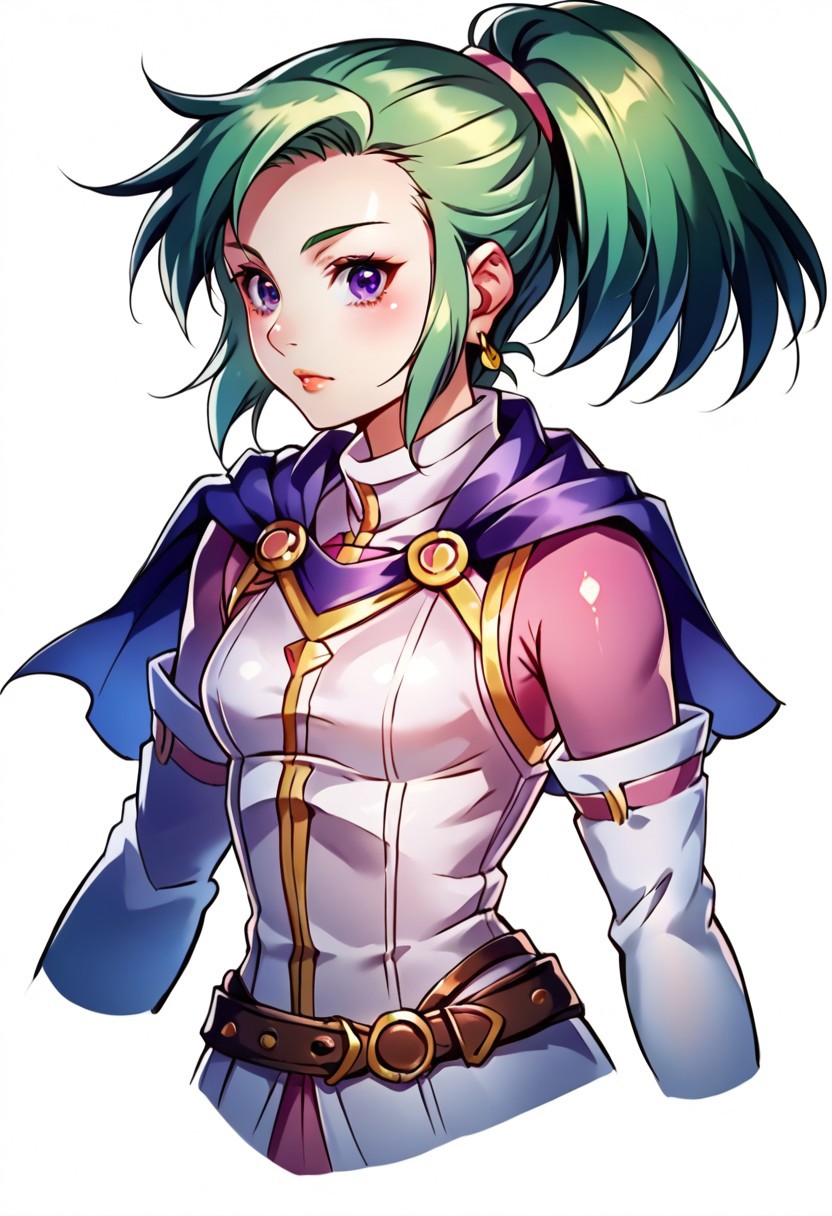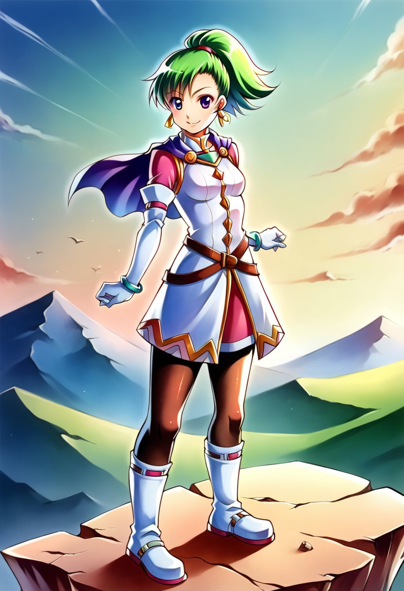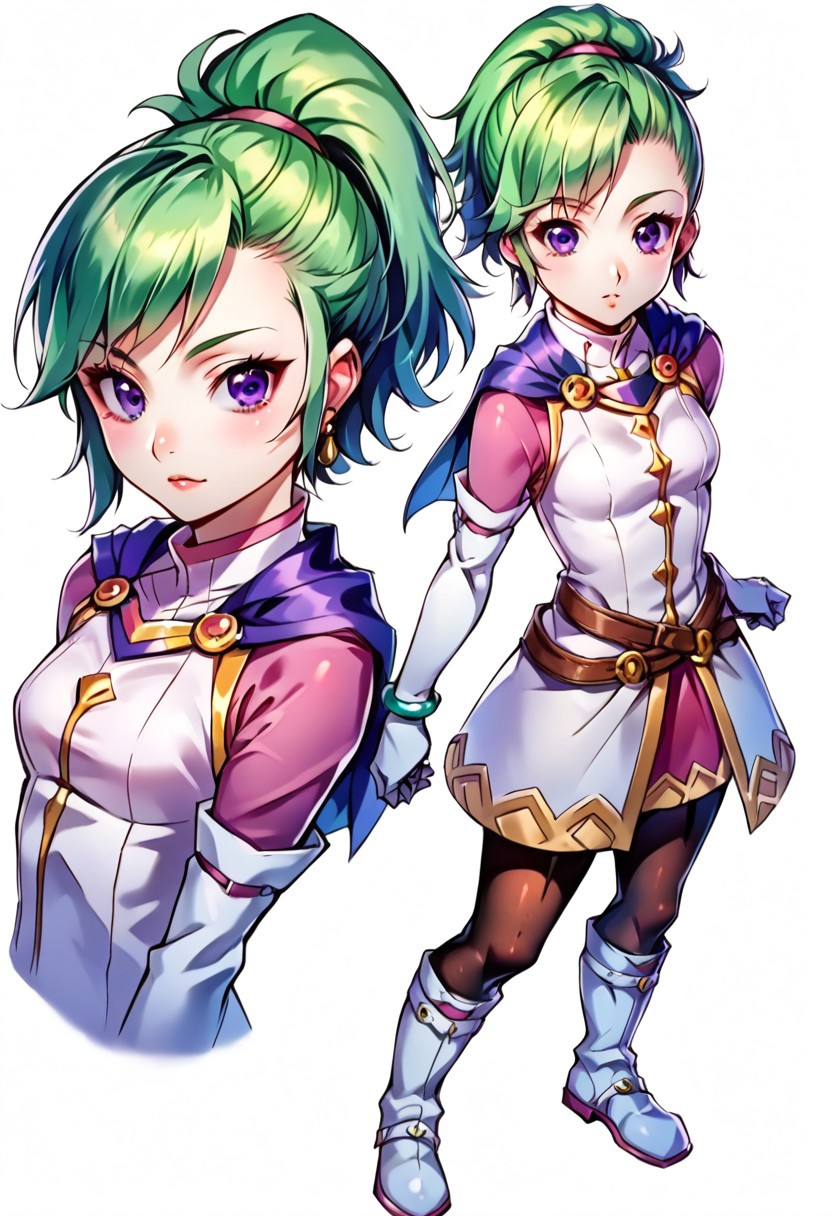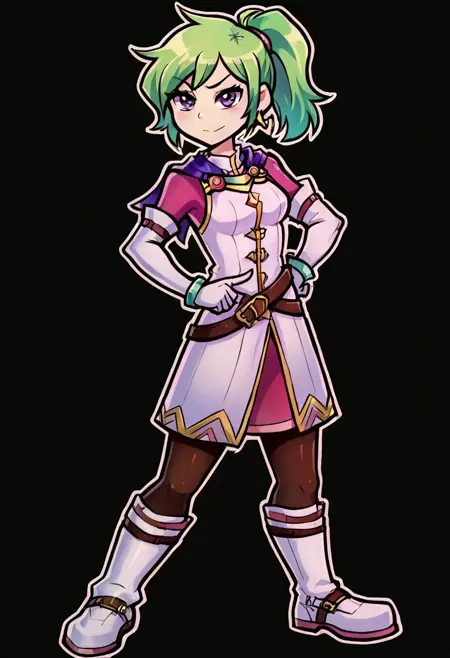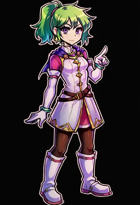 プロンプト: 緑の髪、ポニーテール、前髪、非対称な髪型、サイドロックス、紫色の目、三角形のイヤリング、キャップレット、青いキャップレット、小さな胸、中国領、コート、白いコート、リボンのトリム、ゴールドのトリム、アンダーシャツ、ピンクのシャツ、ピンクの袖、クロスベルト、ミニスカート、ピンクのスカート、白い手袋、肘まである手袋、ブレスレット、黒いパンスト、白いブーツ、膝上ブーツ