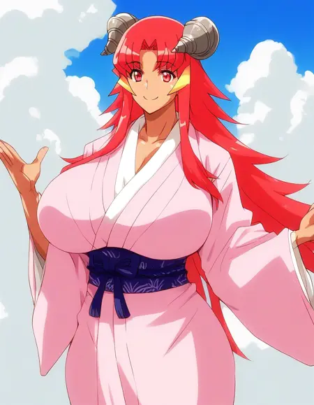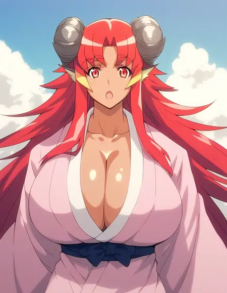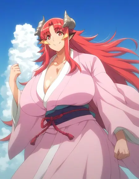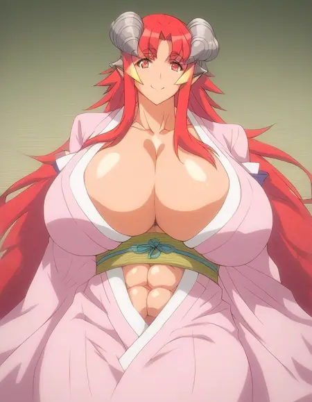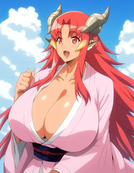 Kurenai(Shaga), 1girl, solo, red hair, horns, long hair, huge breasts, red eyes, dark skin,