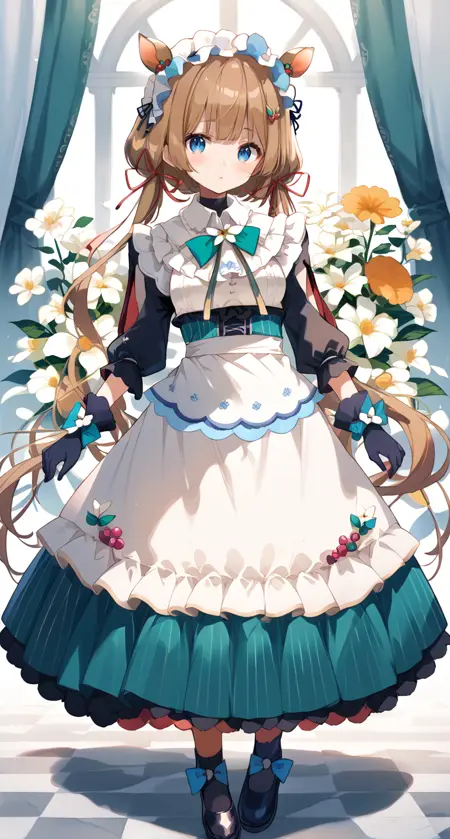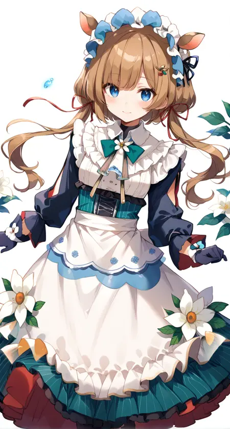 ribbon, skirt, twintails, waist apron, white apron, white background, white dress, white flower,