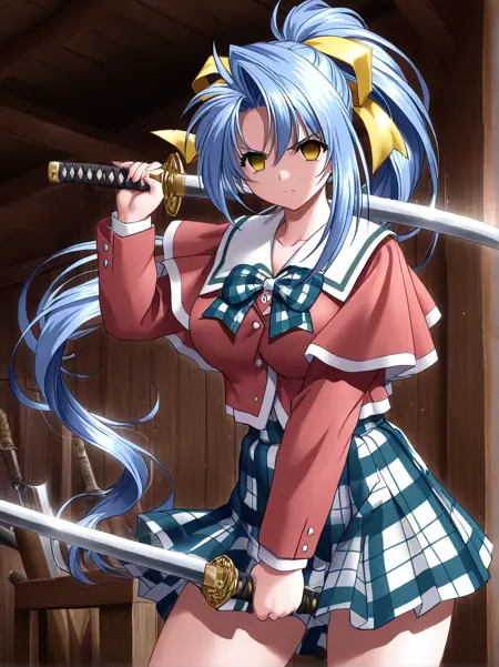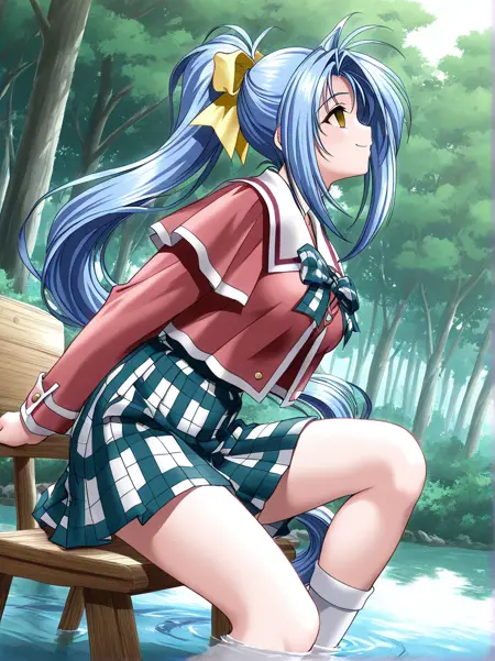 웨이트: 1~0.8 (헤어 리본(노란색 체크 무늬 리본)을 강하게 학습하고 있으며, 제거하려면 웨이트를 낮추는 것 외에 방법이 없습니다. 샘플 이미지 참조)