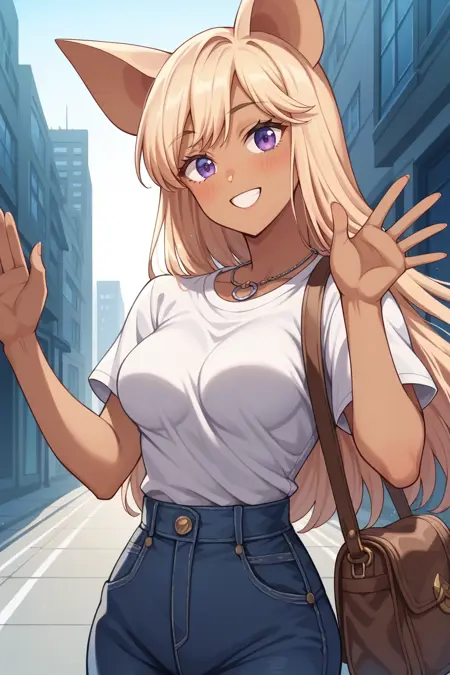 触发词: KJOrose、金发、紫色眼睛、长发、动物耳朵、深色皮肤女性,