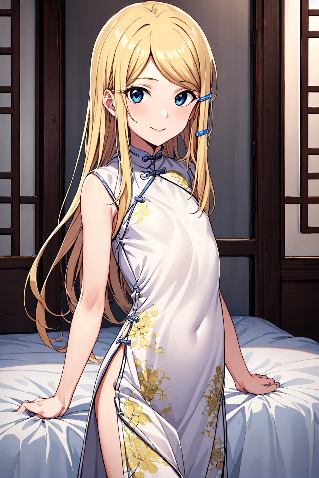 blue eyes, blonde hair, long hair, straight hair, swept bangs