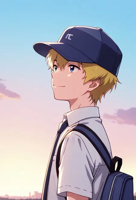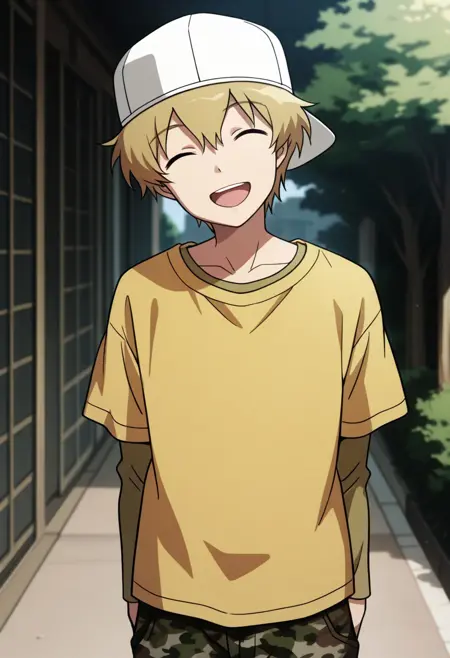 taketri, 1boy, male focus, solo, blue eyes, blonde hair, short hair, bangs, hair between eyes, hat, backwards hat, baseball cap, white headwear, shirt, yellow shirt, short over long sleeves, pants, camouflage pants,
