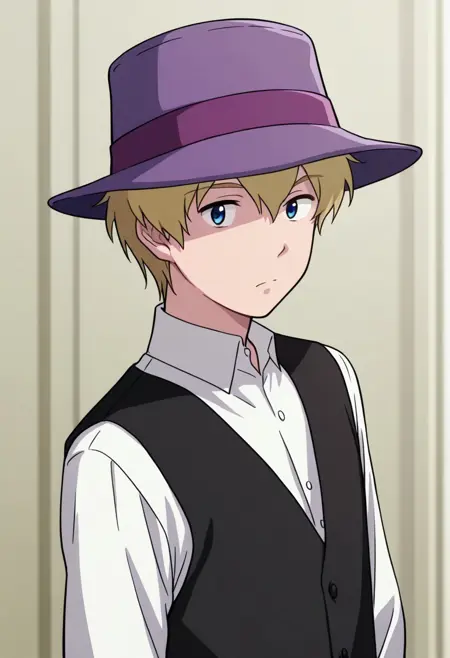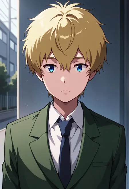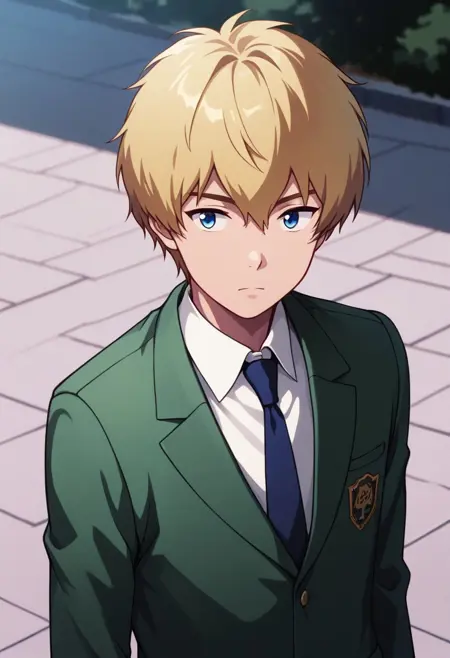 taketri, 1boy, male focus, solo, blue eyes, blonde hair, short hair, bangs, hair between eyes, school uniform, shirt, white shirt, collared shirt, necktie, blue neckie, jacket, blazer, green jacket, pants, brown pants,