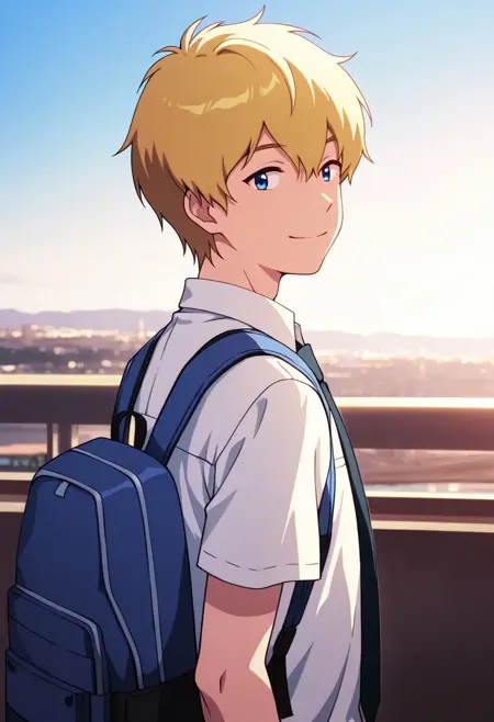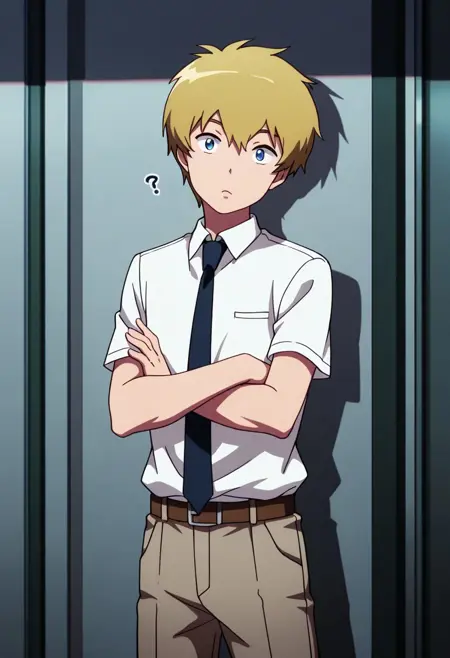 taketri, 1boy, male focus, solo, blue eyes, blonde hair, short hair, bangs, hair between eyes, school uniform, shirt, white shirt, collared shirt, short sleeves, necktie, black neckie, belt, brown belt, pants, brown pants, socks, grey socks, shoes, brown footwear