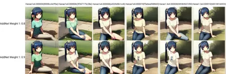 彼女のドレスのスタイルは、グリッドで使われたプロンプトを参照してください。ドレスにリボンがついている画像もあるので、ネガティブプロンプトにも注意してください。もしあらゆるタグを全部使う必要がない場合(たとえばスペースを節約したい場合など)、実験によって判断してください。ドレスを白色にすることが難しかったのですが、「white dress」の重みを1.1に上げたところ解決しました。髪のリボンについてはテストしていませんが、おそらく同様の対応が必要かもしれません。