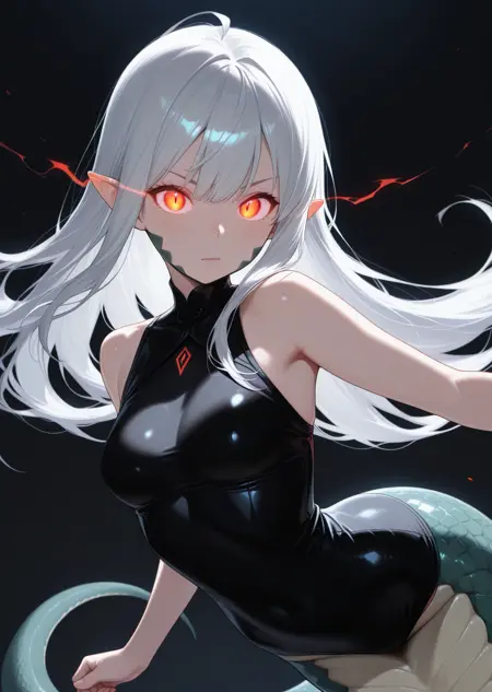 프롬프트: Lam1a, 비늘, 뱀 꼬리, 라미아, 뾰족한 귀, 수직 동공,