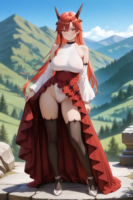 默认服装:露肩,长袖,分离式袖子,白色袖子,锁骨,白色衬衫,红裙,连衣裙,宽袖,项圈,黑色过膝靴,