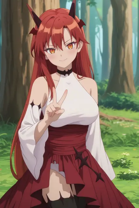 Default Outfit: bare shoulders, long sleeves, detached sleeves, white sleeves, collarbone, white shirt, red skirt, dress, wide sleeves, choker, black thighhighs,