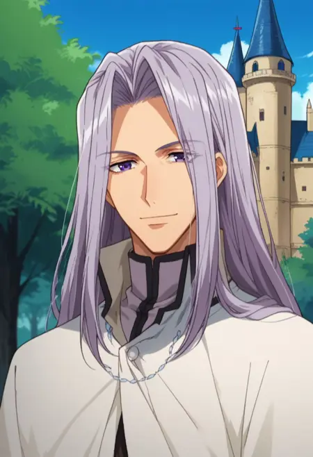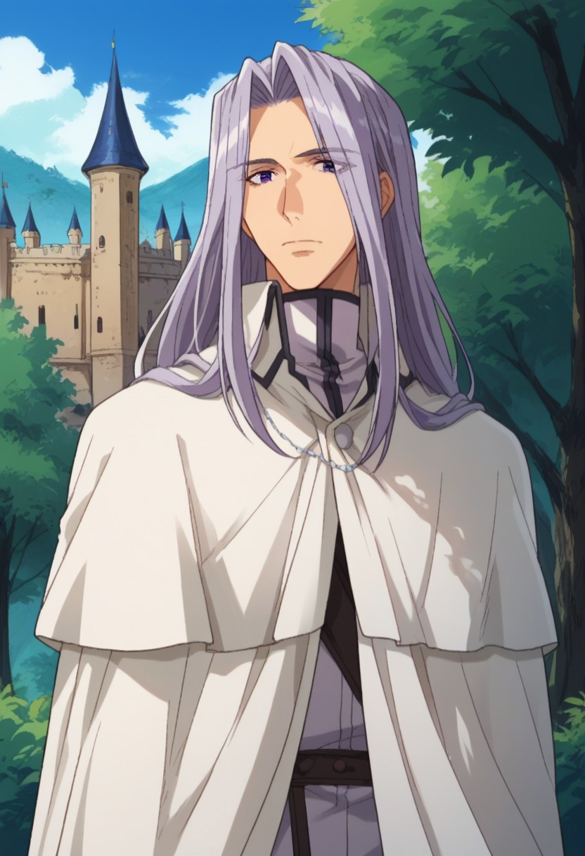 guntervon, 1boy, solo, male focus, long hair, purple eyes, cape, white cape, purple hair, boots, capelet, white cloak