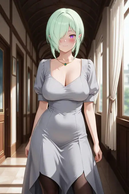 druj,绿发,紫眼,发丝遮住一只眼,尖耳,侧发,一只眼睛被遮住,
