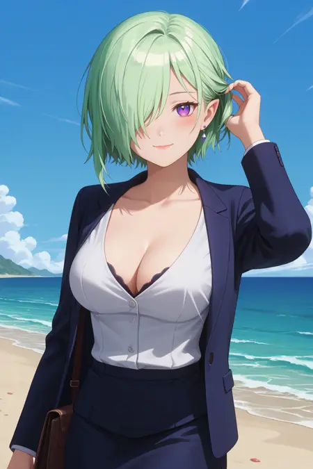 jacket, long sleeves, cleavage, formal, suit, office lady, white shirt, earrings, jewelry, collarbone, black skirt,
