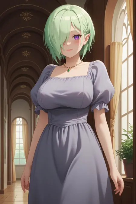 druj, green hair, purple eye, hair over one eye, pointy ears, sidelocks, one eye covered,