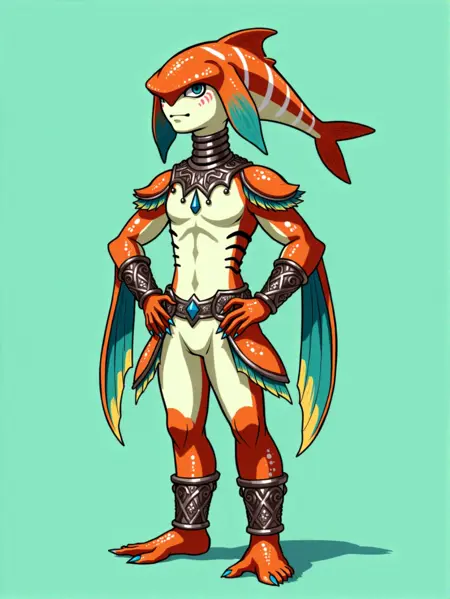 The Zora, also known as the Zora Tribe, are a race in The Legend of Zelda series. The Zora are an aquatic folk who possess fish and amphibian like traits, including fins, webbed feet and gills, which allow them to swim and thrive underwater. Zora can come in many shapes and sizes, but are most commonly depicted as humanoids with long tail fins on their heads and finned appendages on their arms and legs. They are protectors of water.