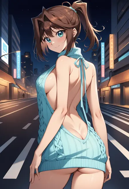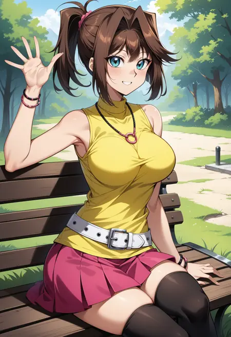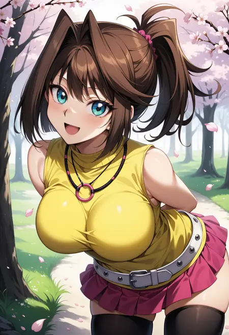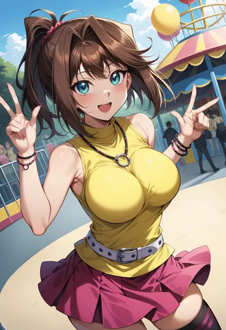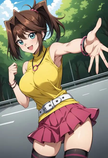 outfit2 (Anime Style)aaanzu, solo, medium hair, brown hair, ponytail, aqua eyes, breasts, turtleneck, necklace, yellow shirt, sleeveless, bracelet, white belt, miniskirt, pink skirt, black thighhighs, anime_style