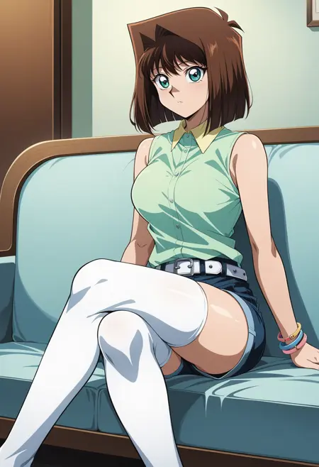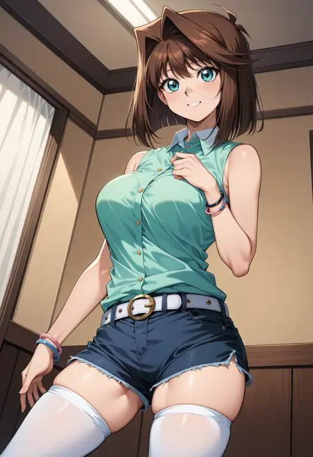 outfit3aaanzu, solo, medium hair, brown hair, aqua eyes, breasts, collared shirt, green shirt, sleeveless, bracelet, short shorts, blue shorts, white belt, white thighhighs