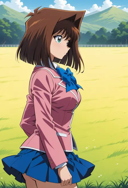 outfit1 (Anime Style)aaanzu, solo, medium hair, brown hair, aqua eyes, breasts, school uniform, blue bowtie, blazer, pink jacket, long sleeves, pleated skirt, blue skirt, anime_style