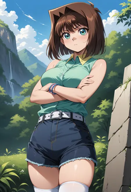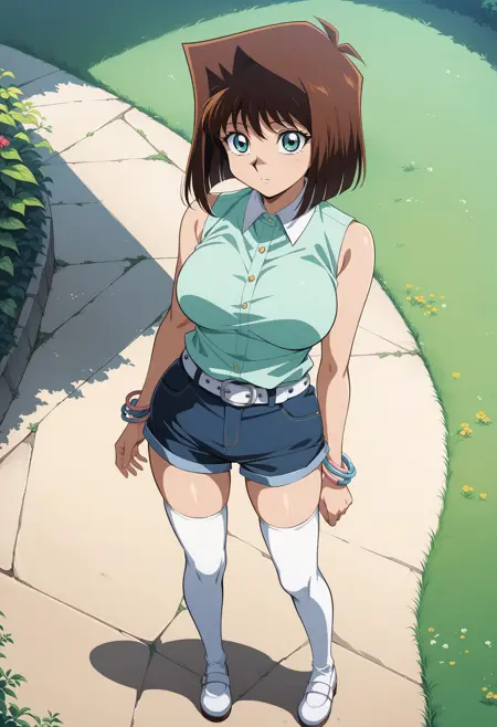 outfit3 (Anime Style)aaanzu, solo, medium hair, brown hair, aqua eyes, breasts, collared shirt, green shirt, sleeveless, bracelet, short shorts, blue shorts, white belt, white thighhighs, anime_style