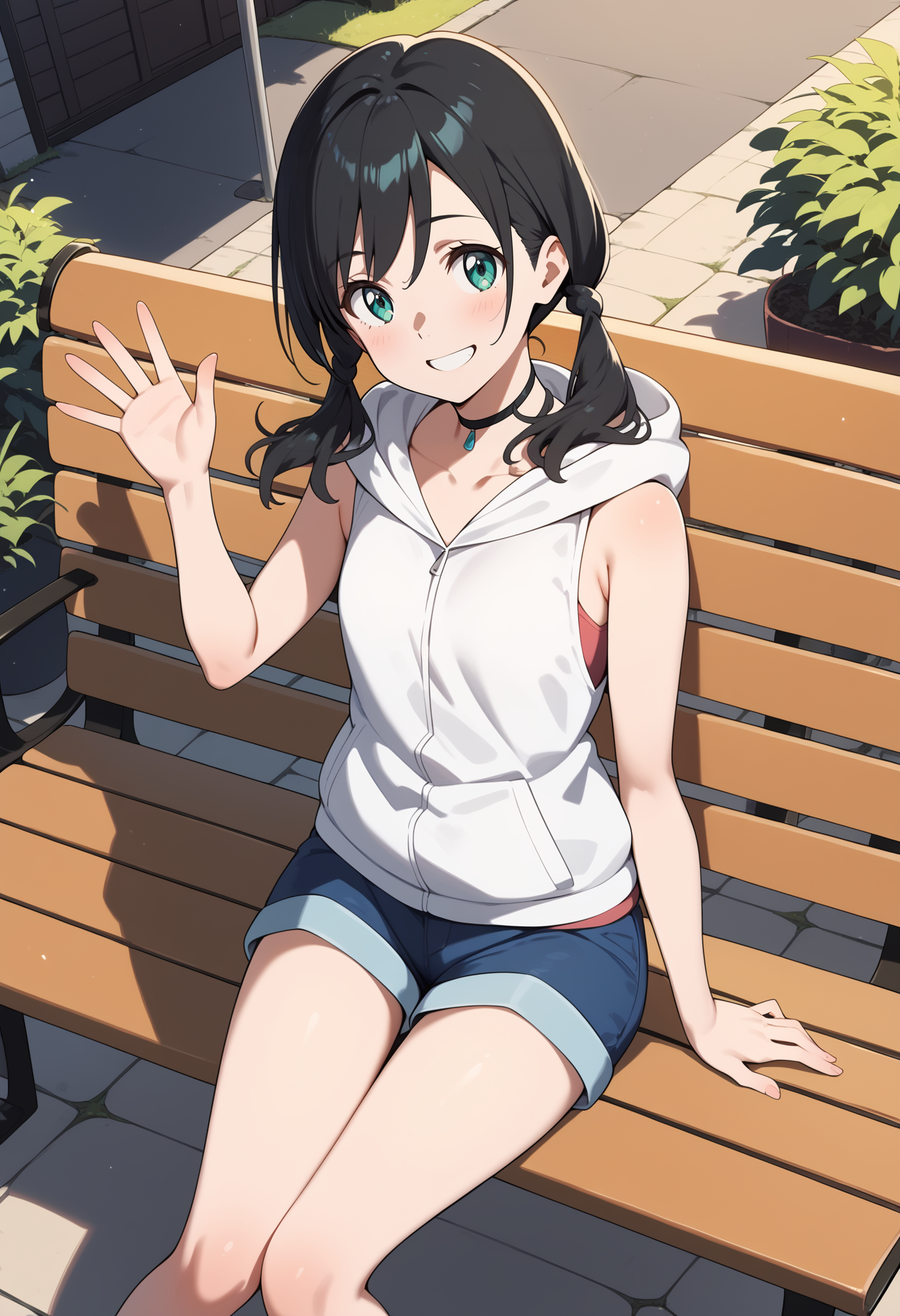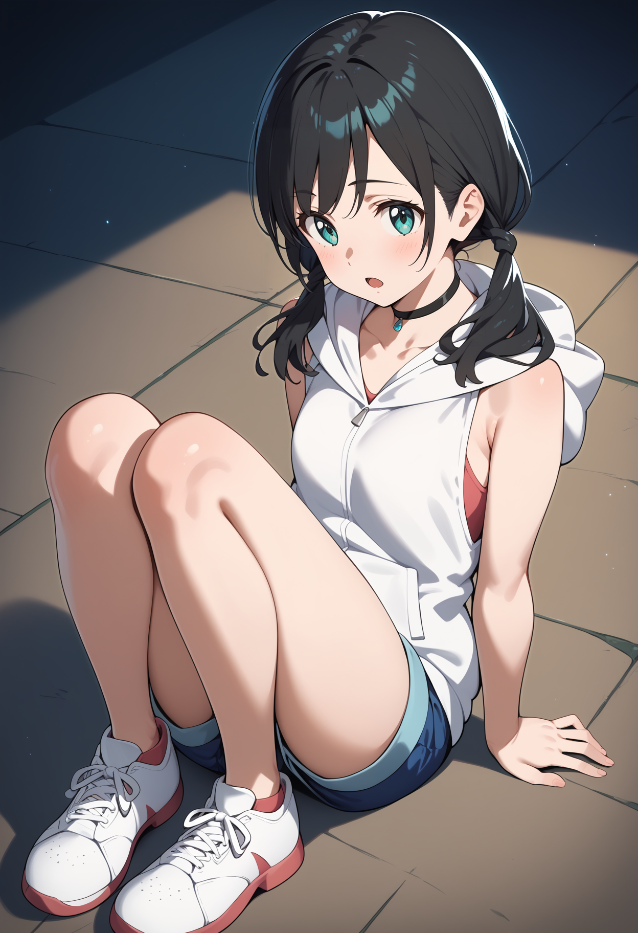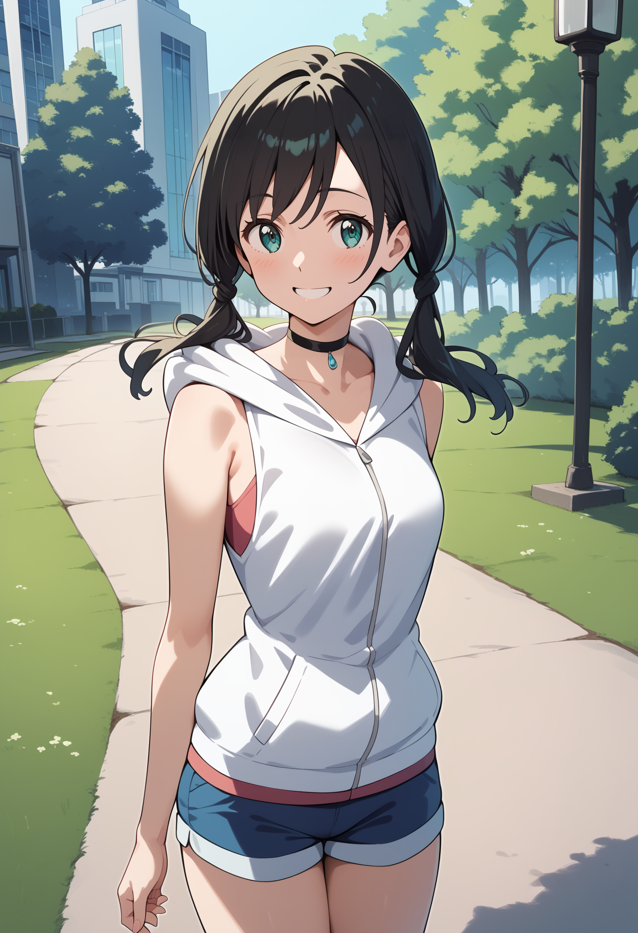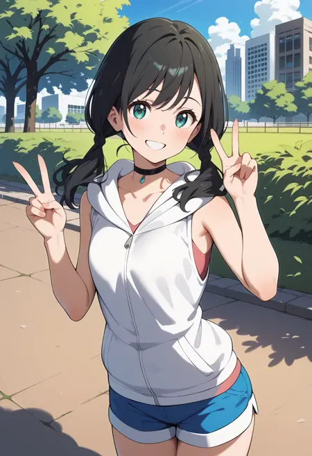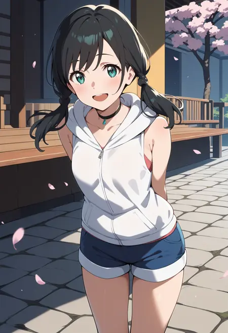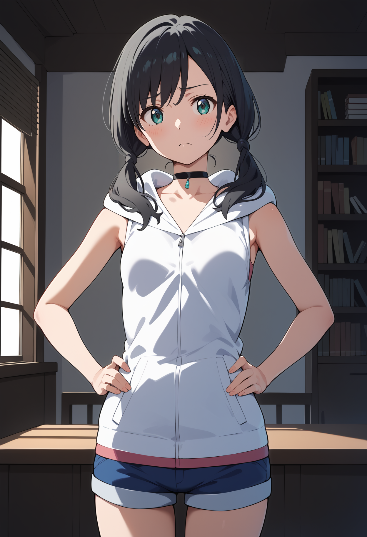 outfit1aahina, medium hair, black hair, low twintails, aqua eyes, small breasts, black choker, collarbone, bare shoulders, hood down, hooded jacket, white hoodie, sleeveless, short shorts, blue shorts