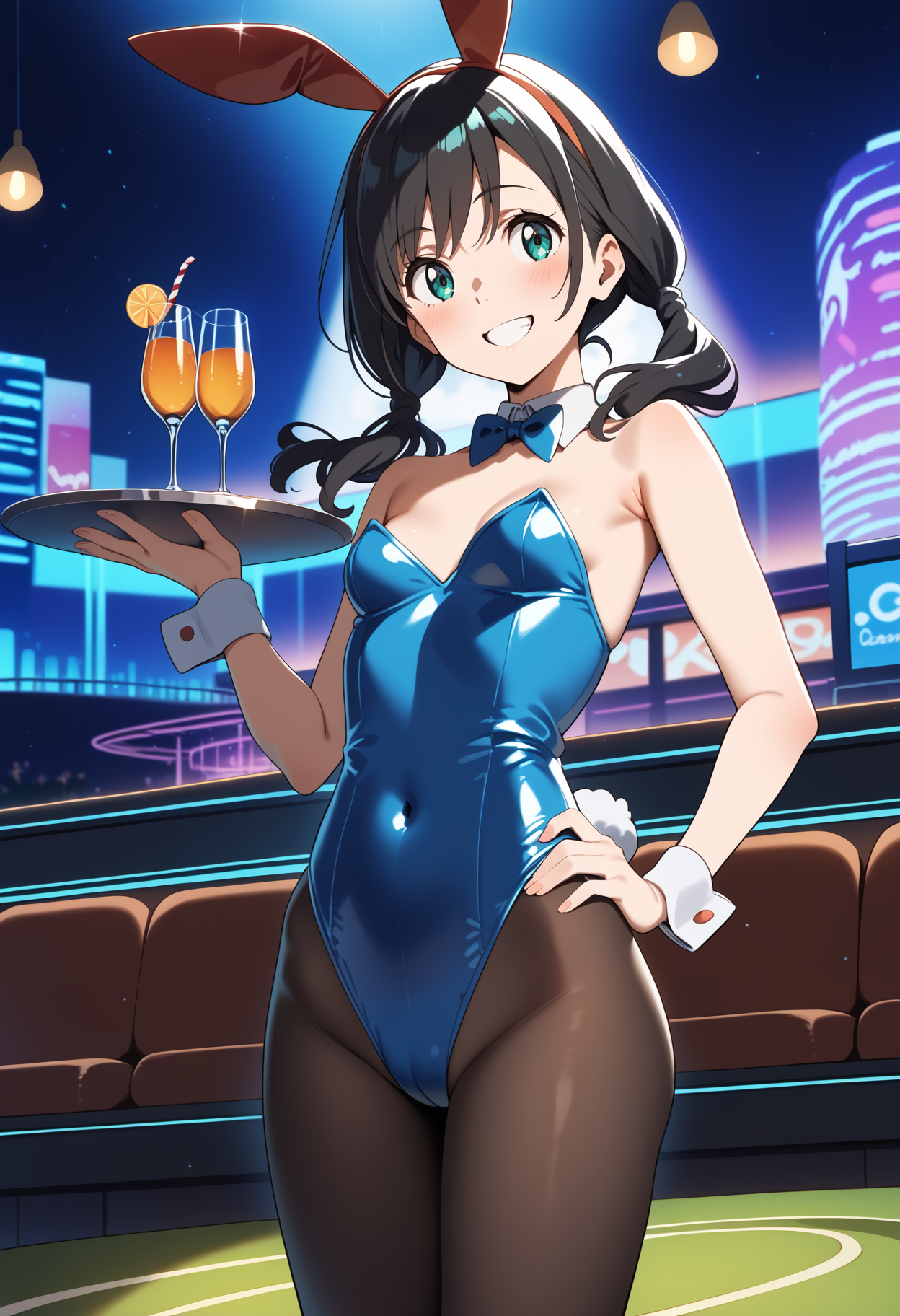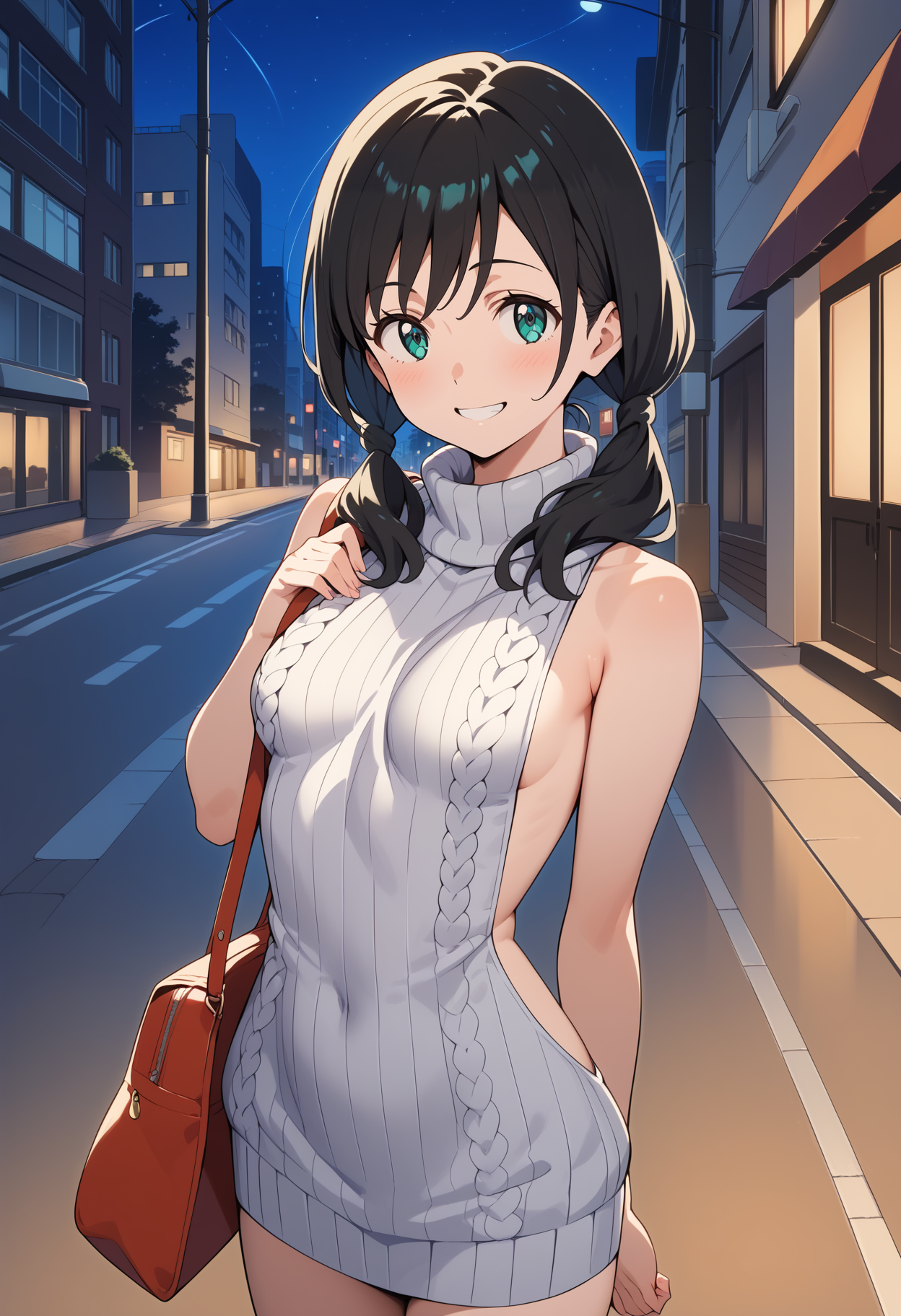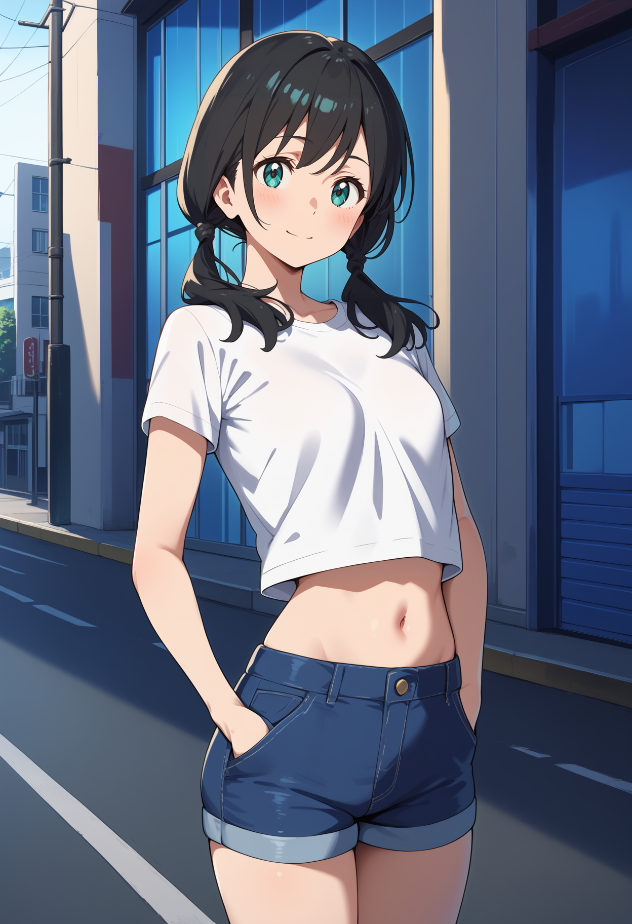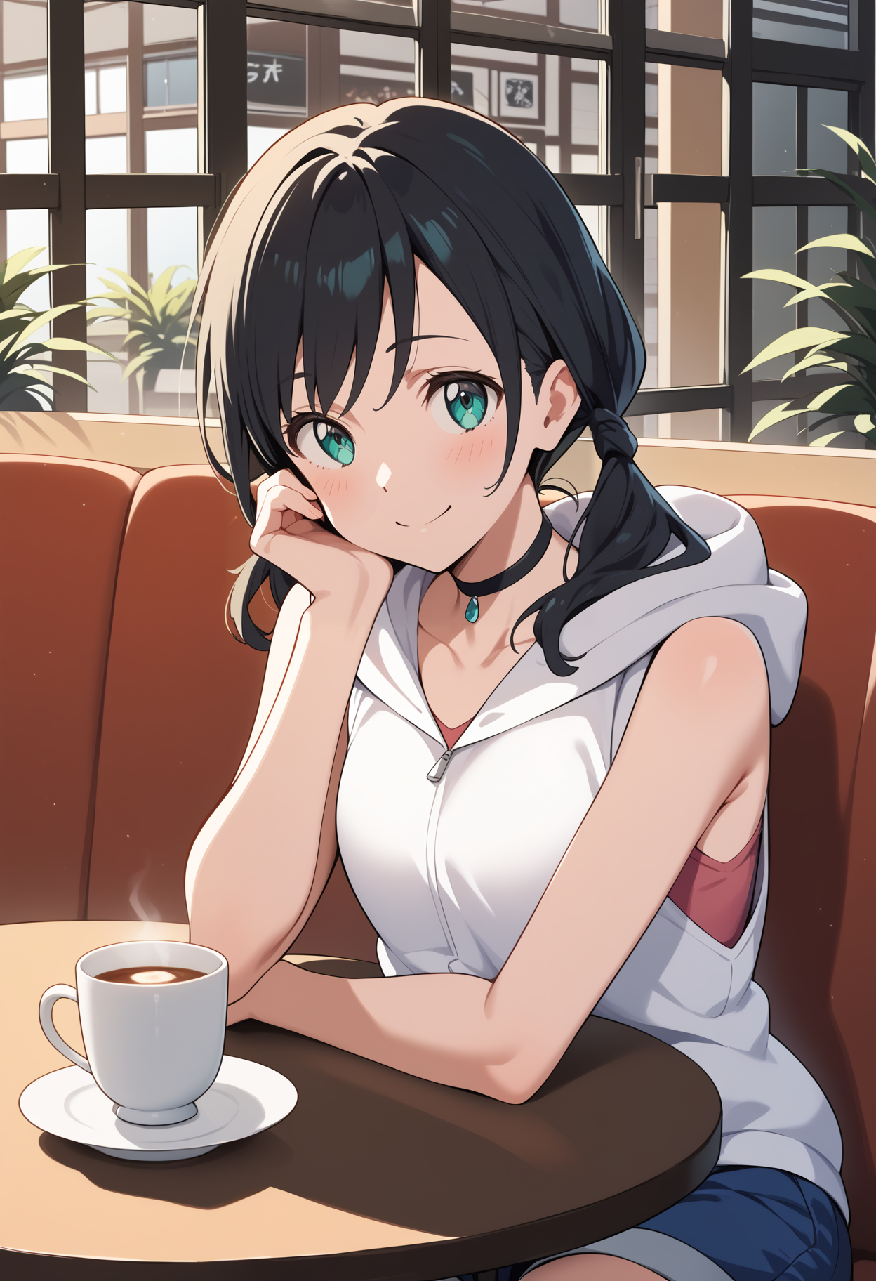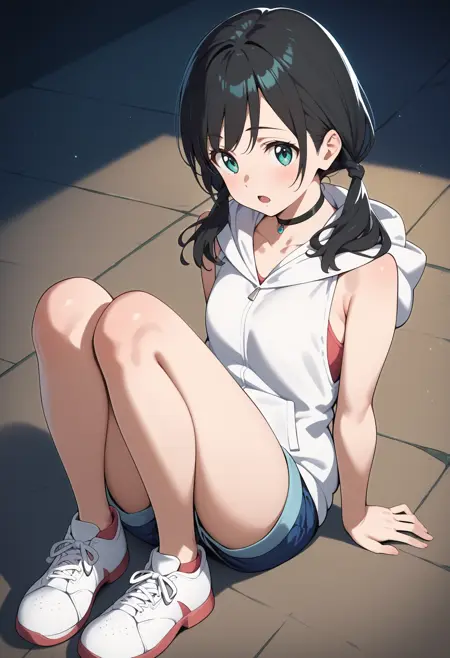 outfit1aahina, medium hair, black hair, low twintails, aqua eyes, small breasts, black choker, collarbone, bare shoulders, hood down, hooded jacket, white hoodie, sleeveless, short shorts, blue shorts