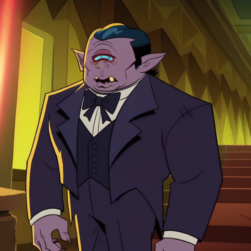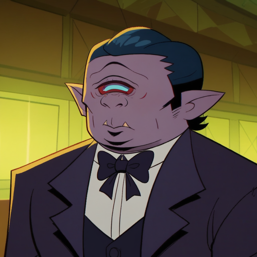 cyclopsservants, 1boy, solo, no humans, colored skin, purple skin, pointy ears, cyclops,