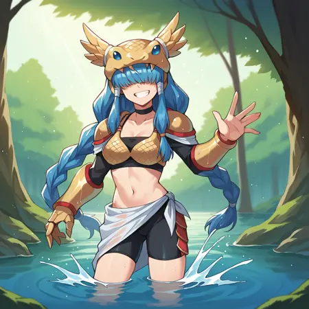 Mvon, Minervamon, 長い髪, 青髪, ツインビッド, 編みこみツインテール, 目を覆った状態, 目の上にヘルメット, 蛇の頭, 翼付きヘルメット