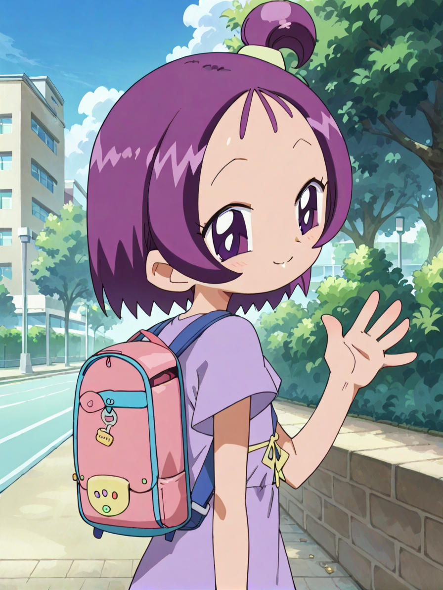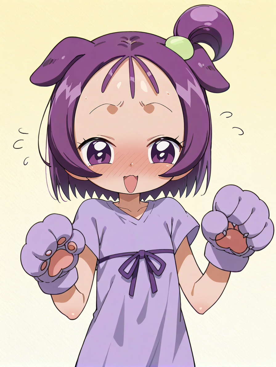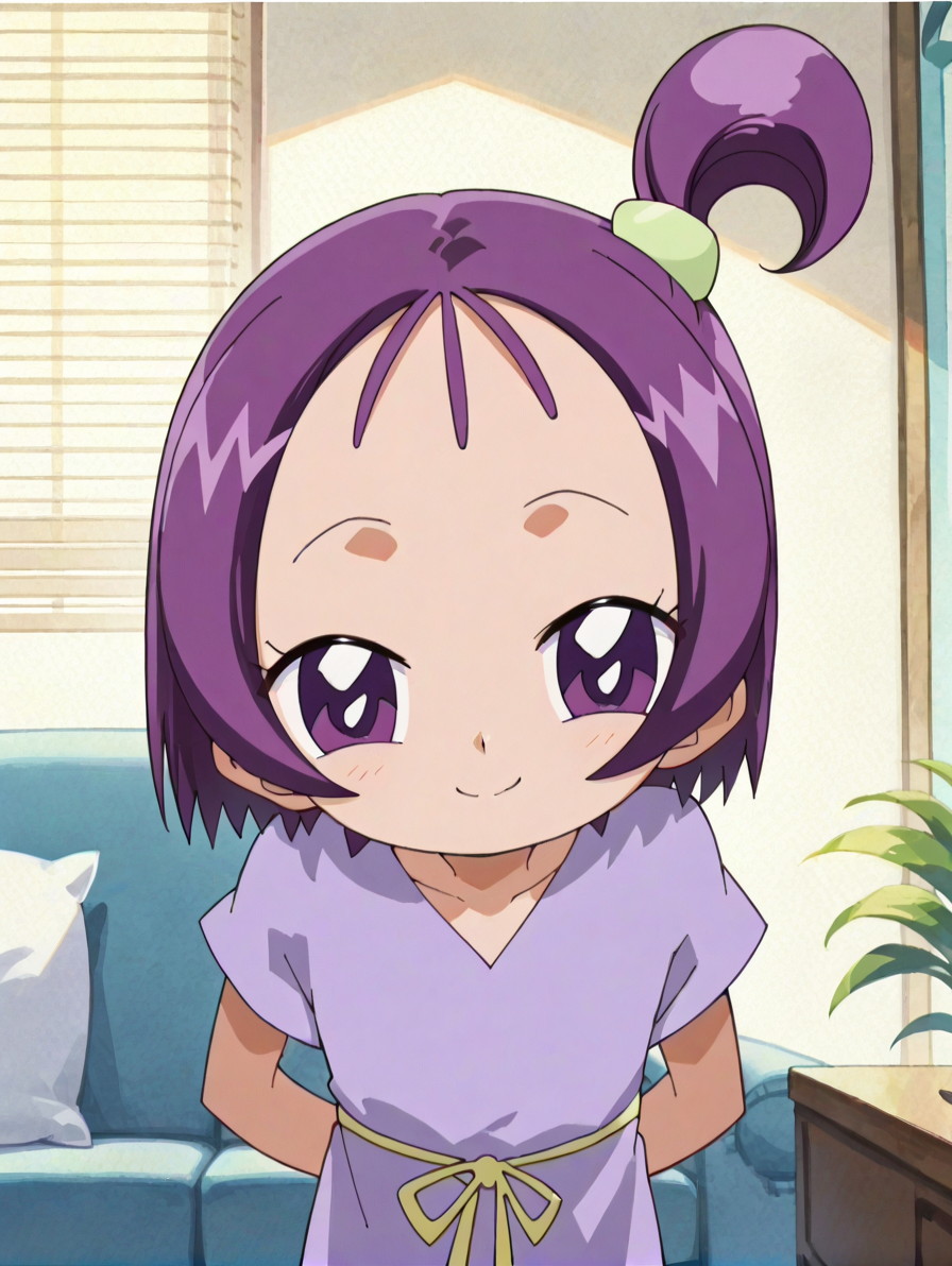 Trigger word: onpusegawa, short hair, purple hair, one side up, purple eyes, hair ornament, shirt, dress, bike shorts