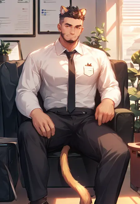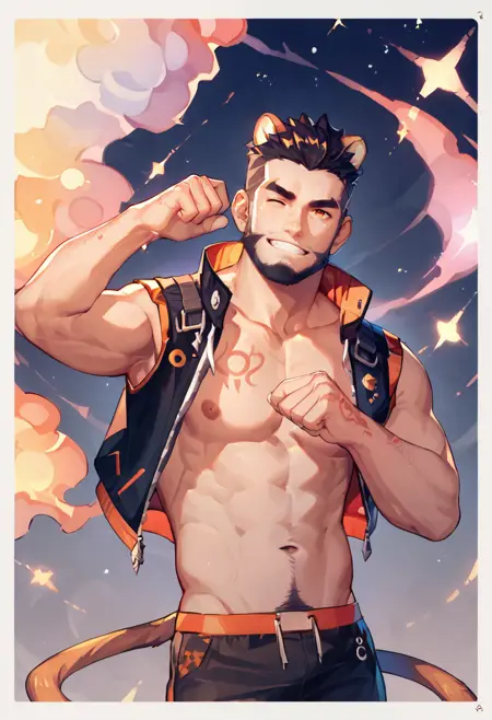 トリガーワードはAlcanderです。「male, beard, animal ears, tail」と追加すると、よりAlcanderに近くなります。また、ジャケットのトリガーも追加しました。