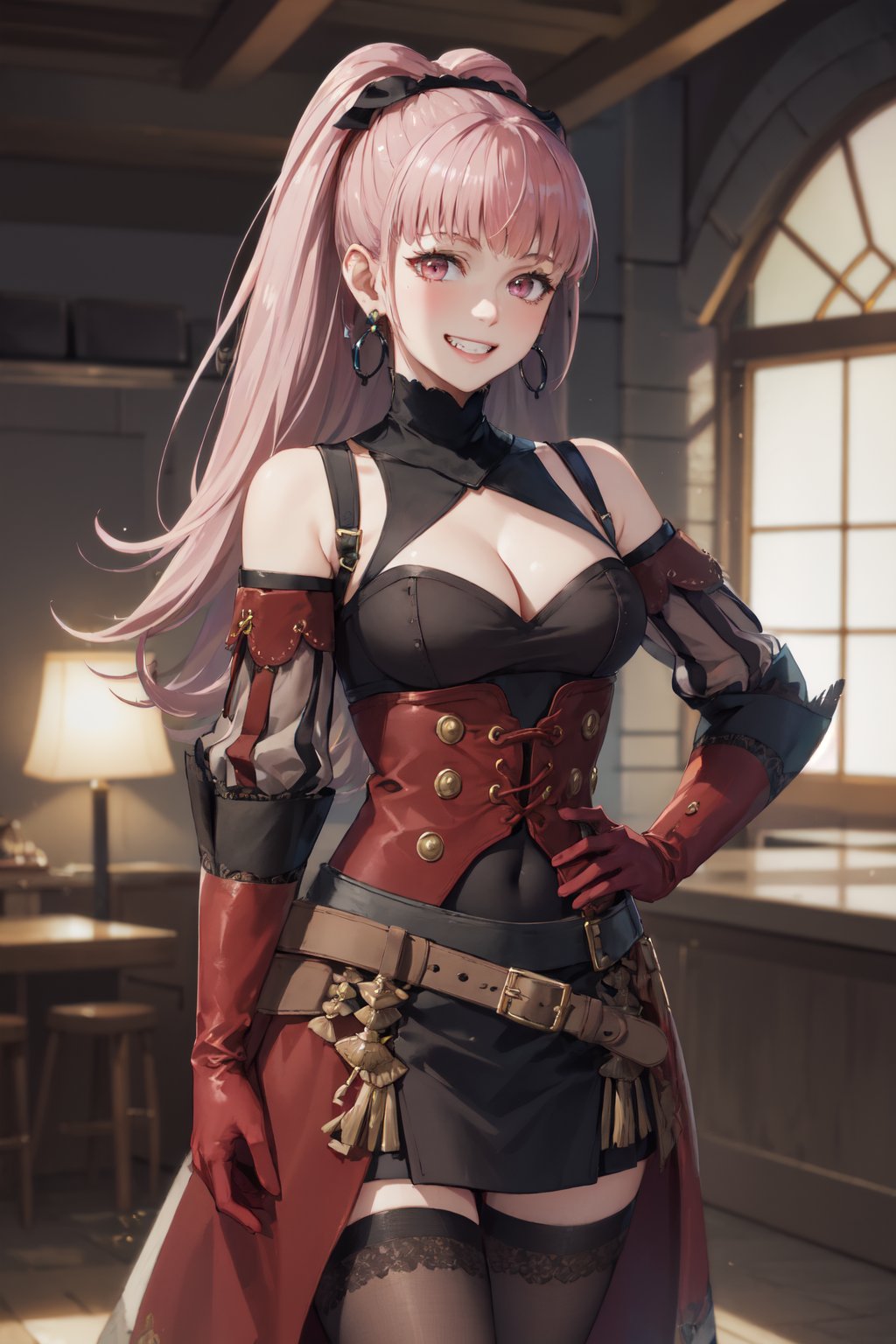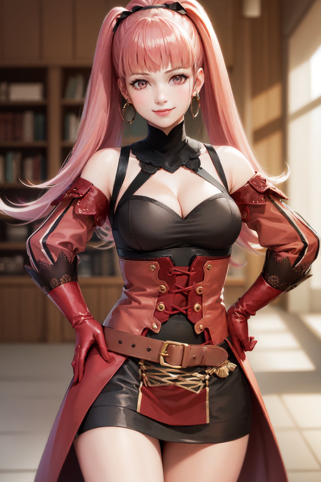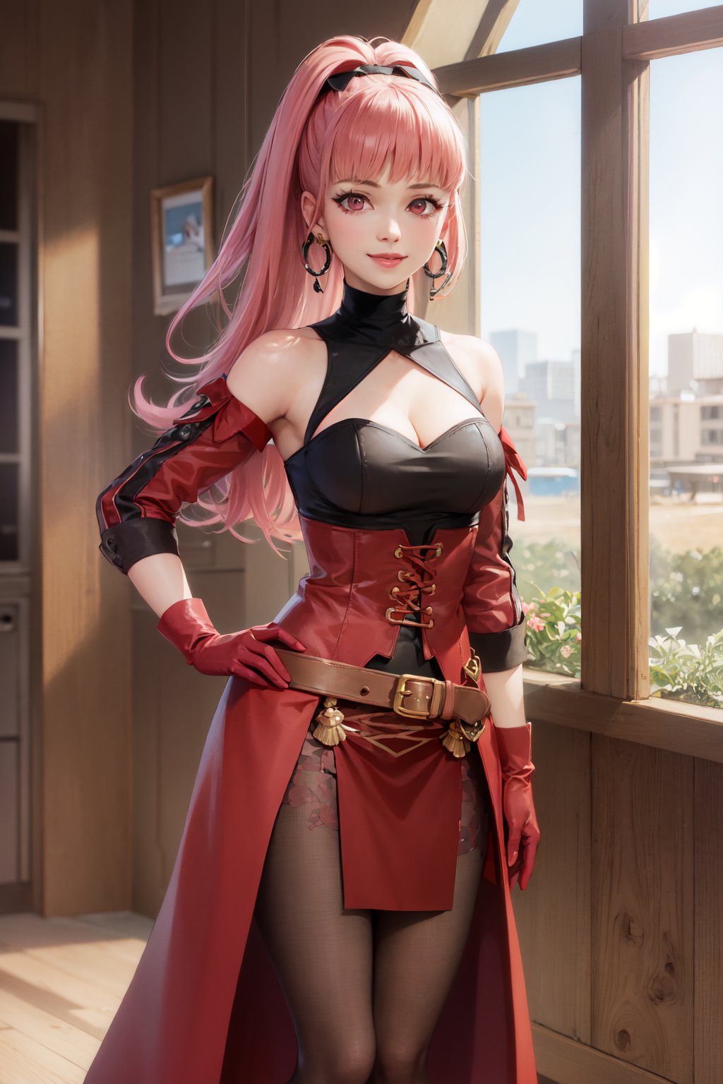 3H Timeskip: hildaalt, ponytail, dress, clothing cutout, detached sleeves, red gloves, thighhighs, hoop earrings, bare shoulders, cleavage