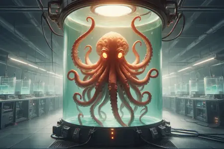 "score_9, score_8_up, score_7_up, score_6_up, score_5_up, score_4_up (close up shot of a monster (octopus:1.4), swimming inside vertical test glass Containment Tube filled with liquid, orange glowing tube, labb assitants studying the monster, labb in background, cinematic glow, anime style:1.2)"