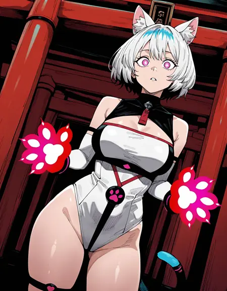 提示词: 使用“红色眼睛”、“粉色头发”、“戏剧性光影”和“鲜艳色彩”。