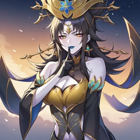 Phantylia, Phan_1st, black hair, blue skin, yellow eyes, blue lips, gold headpiece, black gloves, long hair, jewelry, hair stick, fingernails, bead necklace, forehead ornament,